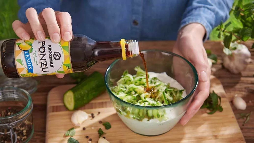 Rasp voor de bereiding van de tzatzikisaus de groene komkommer in een kom. Voeg de mayonaise, yoghurt, Kikkoman Ponzu Citroen en peper toe. Voeg de geperste knoflook toe en meng alles goed door elkaar.