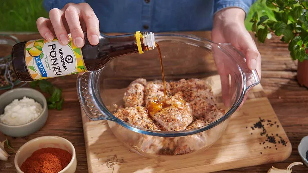 Meng voor de marinade de yoghurt met Kikkoman Ponzu Citroen in een kom. Voeg de geperste knoflook en de kruiden toe en meng goed. Marineer de kip in de ontstane saus en zet deze minstens 2 uur in de koelkast.