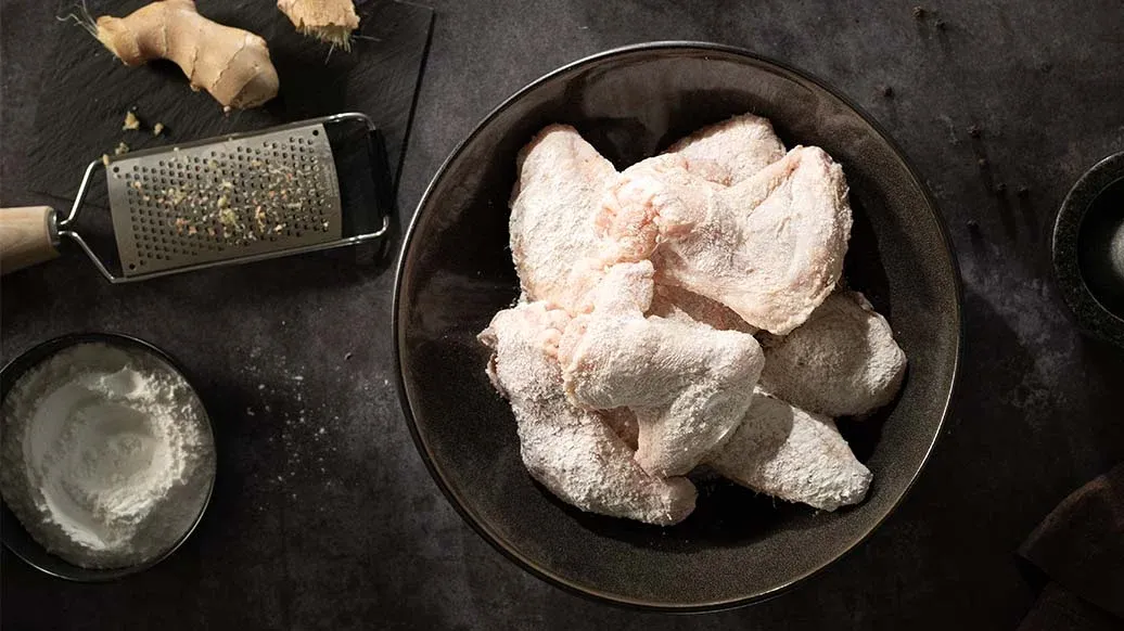 750 g kipvleugels – 2 snufjes versgemalen peper – 3 el fijngehakte gember – 150 g maïzena – 2 tl bakpoeder