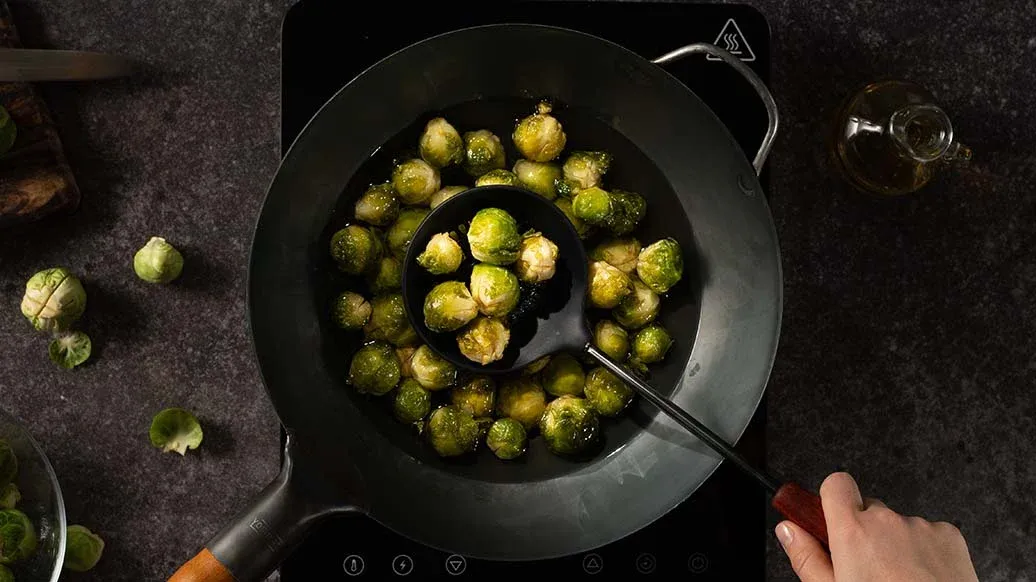 Verhit de olie in een grote wok. Zodra een spruitje bij aanraking met de olie onmiddellijk begint te borrelen, is de olie heet genoeg (ca. 175 °C). Frituur de spruitjes in twee porties ongeveer 4 minuten, tot ze knapperig van buiten en zacht van binnen zijn. Haal ze uit de wok en laat ze goed uitlekken.