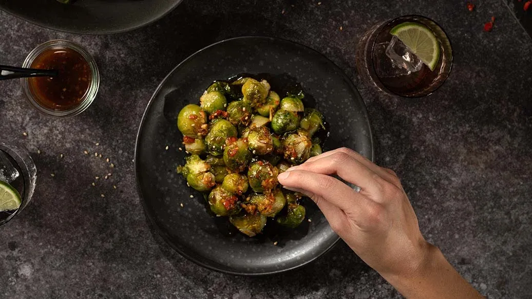 Knapperig gebakken spruitjes geserveerd als salade met een intens aromatische teriyakidressing van geroosterde knoflook en veel nootachtige, geurige sesamzaadjes. Een wintersalade die snel en gemakkelijk te bereiden is.