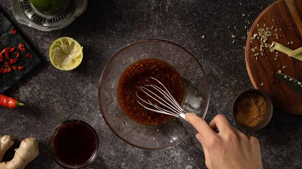 2 limoenen – 3 el groentebouillon – 1 rode chilipeper, fijngehakt – 10 g laos of gember, fijngehakt – 1 klein stengeltje citroengras, heel fijn gesneden – 1 el bruine rietsuiker (alternatief: palmsuiker) – 4 el Kikkoman Teriyaki Saus met Geroosterde Knoflook – 2 el Kikkoman Natuurlijk Gebrouwen Sojasaus