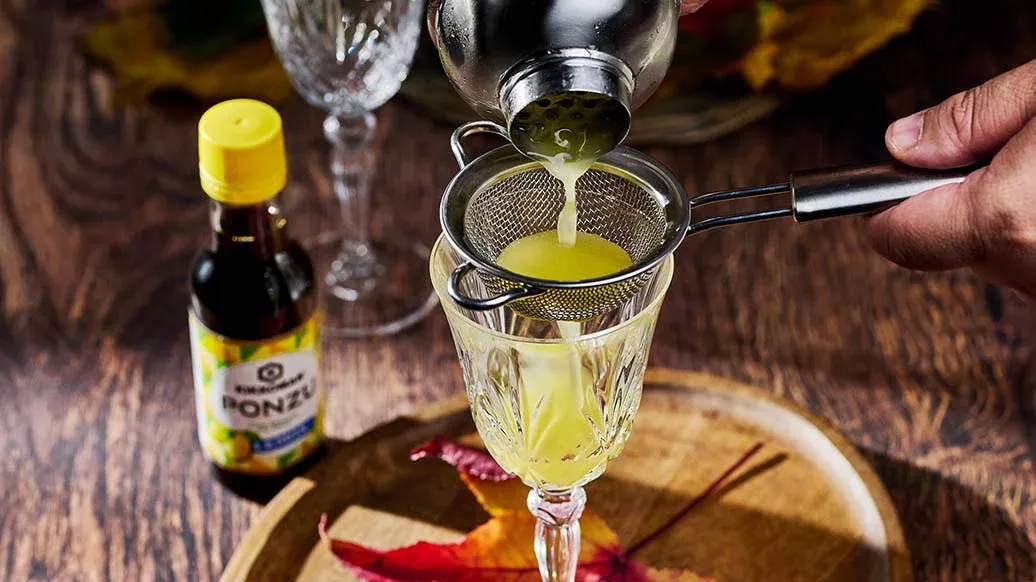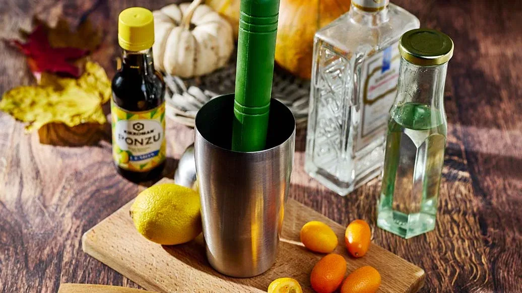 2 cocktailshakers – 1 cocktailstamper – 100 ml wodka – 40 ml citroensap – 40 ml suikersiroop – 2 scheutjes Kikkoman Ponzu - een Mengsel van Sojasaus, azijn en citroensmaakstof – 8 kumquats – 16 ijsblokjes (circa 20 g per blokje)