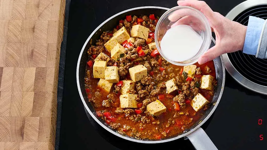 Een pittige favoriet uit de Sichuan-keuken: zachte tofu en gekruid rundergehakt in een rijke saus boordevol umami, afgewerkt een pittige chili-crisp topping.