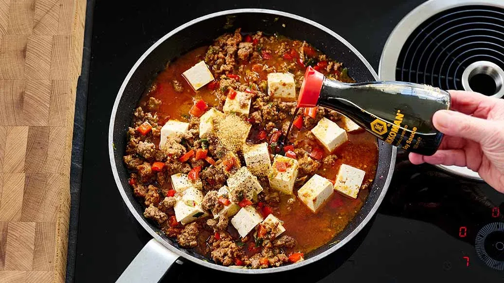400 g stevige tofu – 1 bos(je) lente-uitjes – 1 rode peper – 1 teentje knoflook – 2 el Kikkoman Geroosterde Sesamolie – 400 g rundergehakt