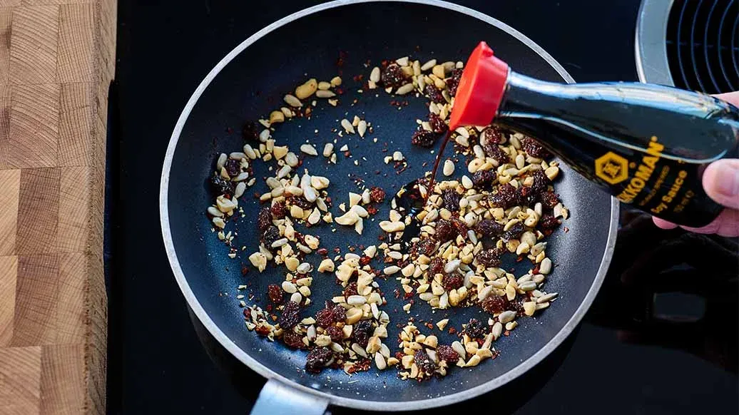 Rooster de chilivlokken, sultana's, pinda's en zaden in een grote pan. Breng op smaak met de Kikkoman Sojasaus en haal uit de pan.