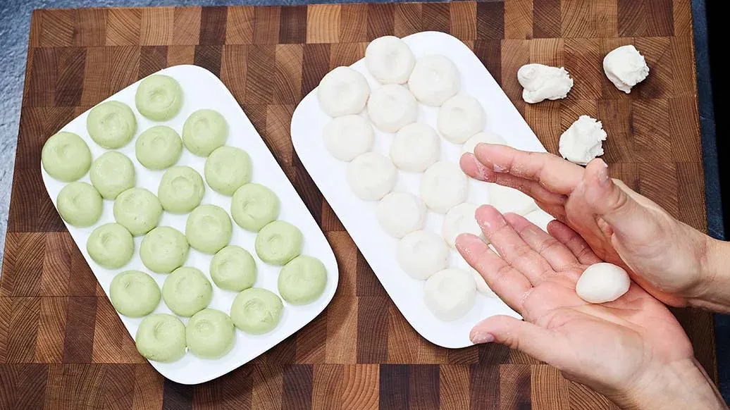 Dep de tofu goed droog en meng deze goed met het rijstmeel, de suiker en de vanillesuiker. Verdeel het deeg in twee helften en kneed het matchapoeder door één helft.