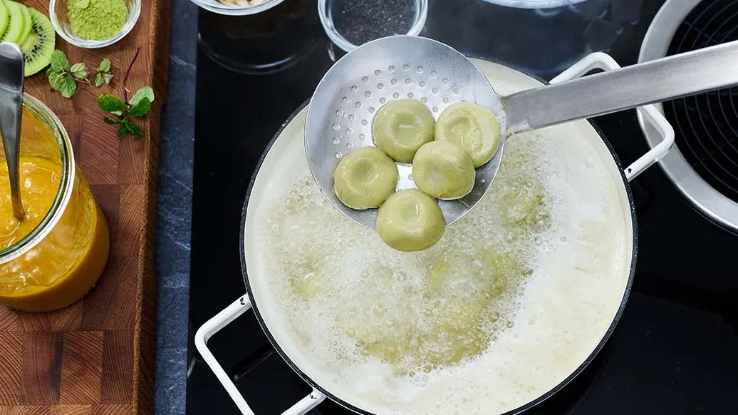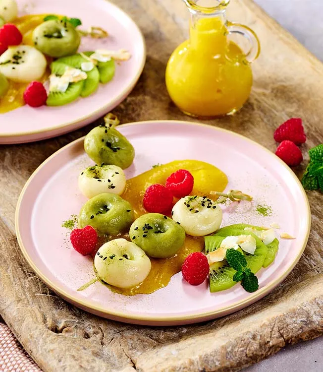 Als de dumplings gaar zijn, haal je ze uit het water, laat je ze even afkoelen in koud of ijswater en giet je ze goed af. Serveer ze op borden met de mangosaus en garneer met de kiwi, munt, een beetje matchapoeder, zwarte sesamzaadjes, kokosvlokken en frambozen.