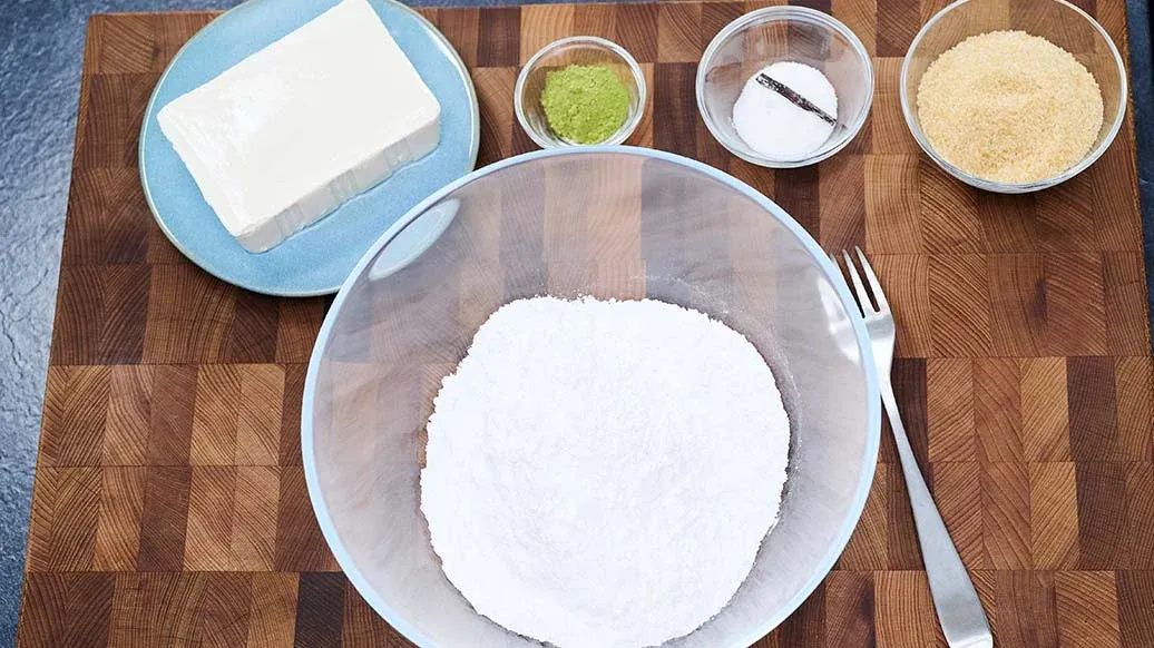200 g zijdezachte tofu – 200 g rijstmeel – 3 el bruine suiker – 2 tl vanillesuiker met bourbonvanille – 1 tl matchapoeder