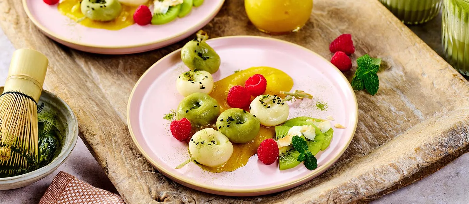 Zachte mochi-dumplings in twee kleuren – de ene subtiel doordrenkt met matcha, de andere zonder smaakstoffen – geserveerd met een zachte, levendige mangosaus. Een licht, fruitig dessert dat heerlijk combineert met een dampende kop thee.