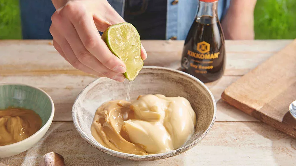 Meng de mayonaise, pindakaas, het limoensap, de Kikkoman Sojasaus en gehakte Spaanse peper (optie).
