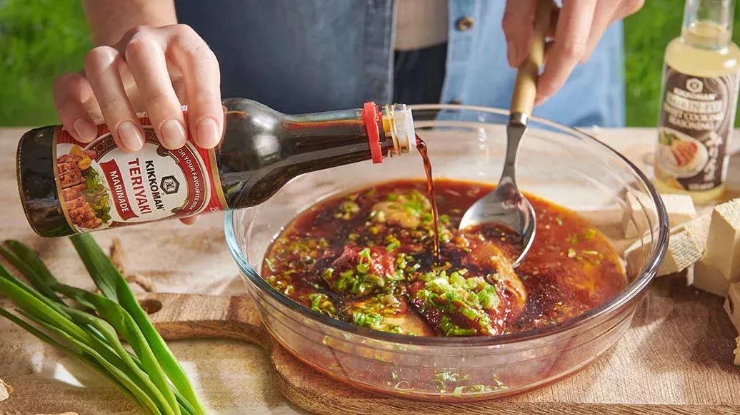Tofuspiesjes gemarineerd in teriyakisaus met sesamolie hebben een oosters karakter. Pindakaas geeft het een romige textuur en Kikkoman Kimchi Chilisaus zorgt voor een pikante noot. Geserveerd met pindakaasmayonaise ontstaat een combinatie van zoete, pikante en romige smaaksensaties.