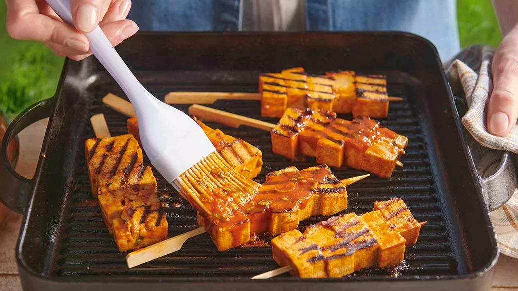 Rijg de gemarineerde tofu aan barbecuespiesjes. Bak beide kanten op een hete grill tot de tofu bruin en licht krokant is.