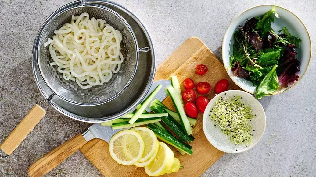 2 porties udon-noedels (bevroren) – 2 el spruitjes – 8 slabladen – 80 g lange komkommer, dun gesneden – 6 cherrytomaten, gehalveerd – 60 g lange wortel, dun gesneden – 4 sneetjes citroen (of limoen)