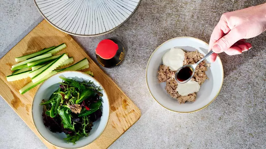 Meng de tonijn met de mayo en Kikkoman Sojasaus.