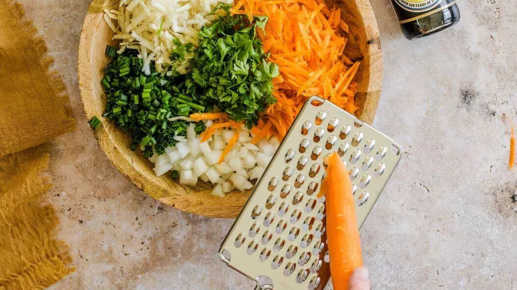 Rasp de wortel en knolselderij. Snijd de ui, bieslook, peterselie en munt fijn en meng ze met de groenten.