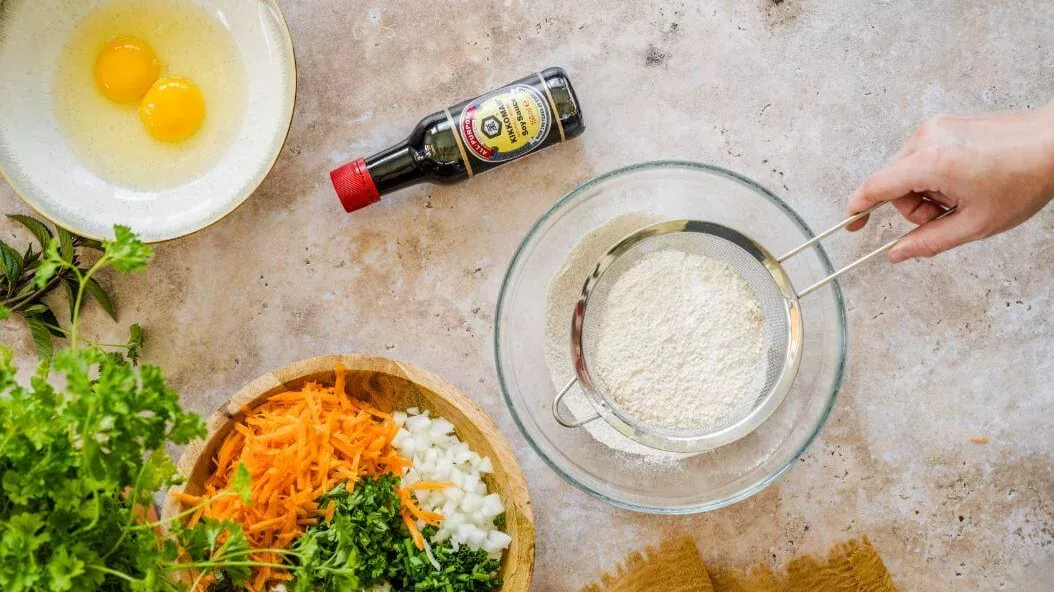 Zeef de bloem en meng met het bakpoeder. Klop de eieren los met de melk en de Kikkoman sojasaus. Meng in een kom de droge ingrediënten met de natte ingrediënten tot een beslag en voeg de groenten met kruiden toe. Breng op smaak met peper en meng goed.