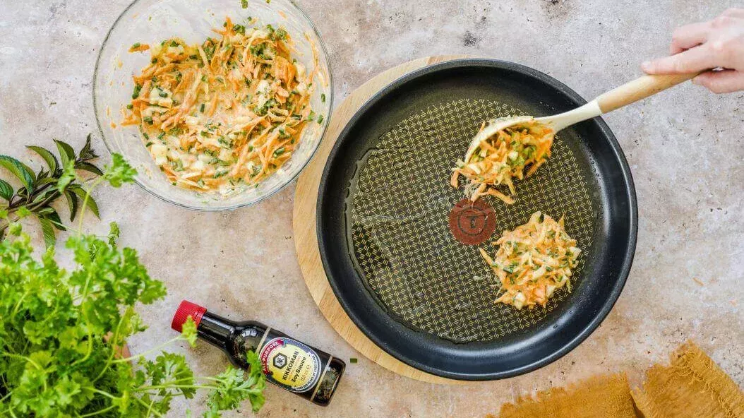 Verhit een klein beetje olie in een koekenpan en zet het vuur laag. Schep er beslag in om kleine pannenkoekjes te maken en bak ze aan beide kanten. Serveer ze warm met kruiden en Kikkoman sojasaus.