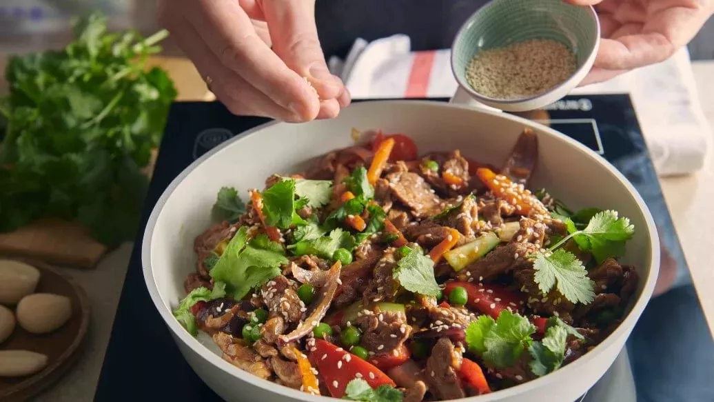 Pittig rundvlees met een mix van paprika, wortel, paksoi en erwten, gemarineerd in Kikkoman Sojasaus met een vleugje sambal oelek of Kikkoman Kimchi Chilisaus, geserveerd met koriander en sesamzaadjes.