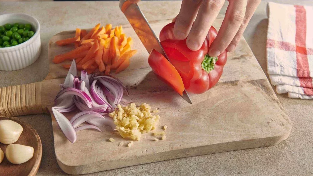 Snijd de knoflook en gember fijn. Snijd de paprika en wortel in reepjes. Snijd de rode ui en paksoi in grotere stukken.