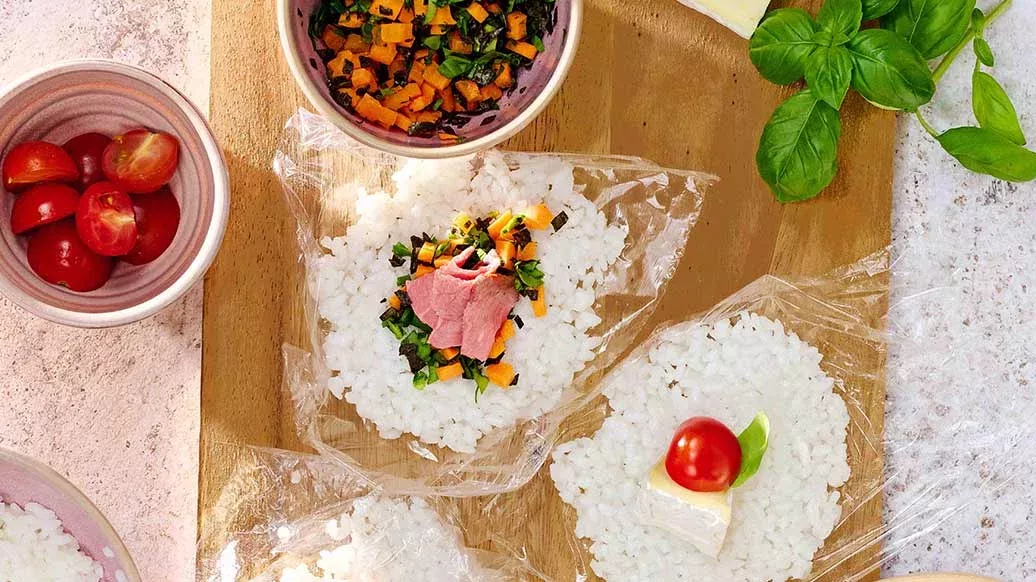 Verdeel de rijst in 20 porties en duw ze zachtjes wat platter met behulp van vershoudfolie. Leg de rosbief, wortel, spinazie en de stukjes norivel in het midden van de 10 porties rijst. Leg de camembert, tomaat en basilicum in het midden van de overgebleven 10 porties. Gebruik de vershoudfolie om kleine balletjes te vormen van de rijst, om de vulling heen.