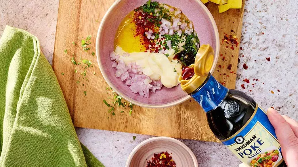 Meng de nog warme rijst met de Kikkoman Smaakverfijner voor Sushi Rijst en zet even apart. Snijd de sjalot fijn. Pureer het mangovruchtvlees en meng het met de sjalot, koriander, chilivlokken, mayonaise en Kikkoman Poke Saus.