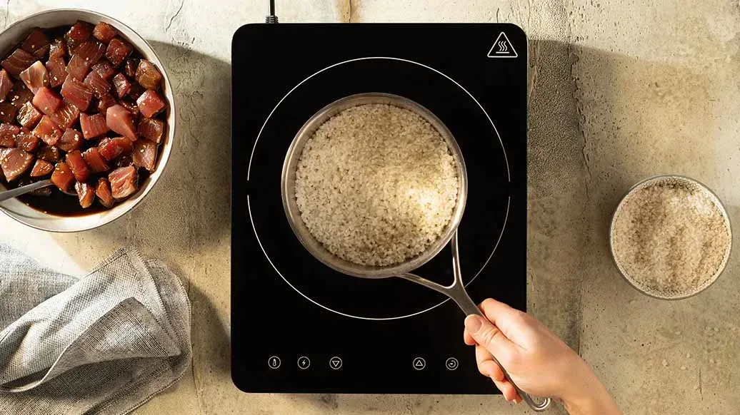 Spoel de sushirijst af in koud water, roer voorzichtig en laat een paar keer uitlekken tot het water bijna helder wegspoelt. Voeg water toe (controleer de verhouding op de rijstverpakking) en breng op middelhoog vuur aan de kook. Verlaag het vuur, dek af en kook op laag vuur in 15-20 minuten gaar.