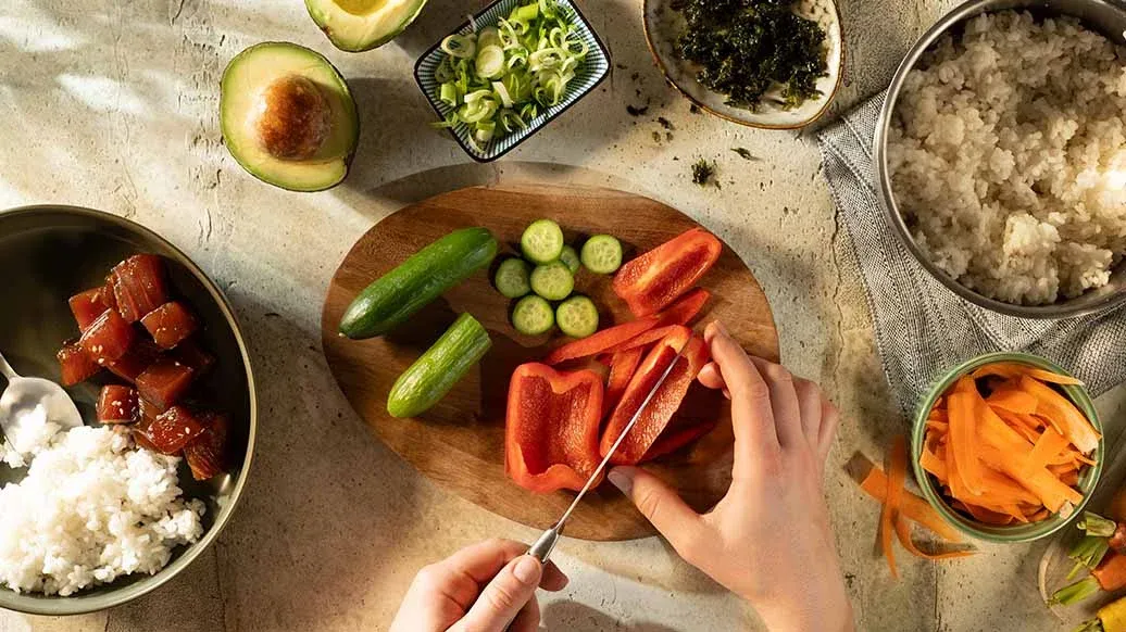Een levendige pokébowl met in zoete sojasaus-gemarineerde tonijn, knapperige groenten en rijst, overgoten met zeewier en chilipeper voor extra bite. Hawaïaanse stijl, makkelijk te bereiden en rijk aan smaak.