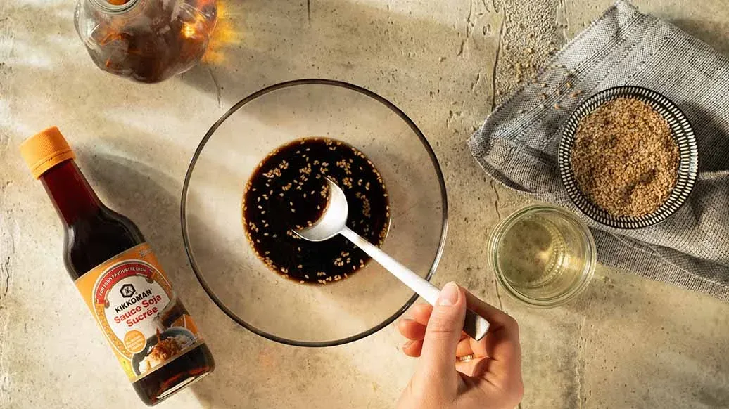 75 ml Kikkoman zoete Sojasaus – 1 el rijstazijn – ½ el Kikkoman Geroosterde Sesamolie – ½ el sesamzaad