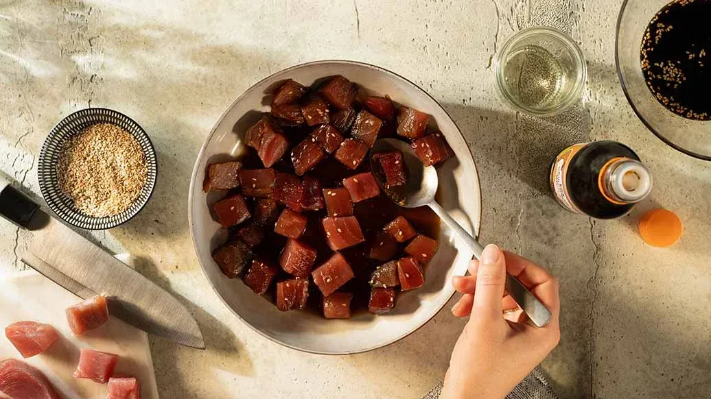Doe de tonijnblokjes in een grote kom en giet de marinade erover. Meng voorzichtig, dek af en zet minstens 15 minuten in de koelkast.
