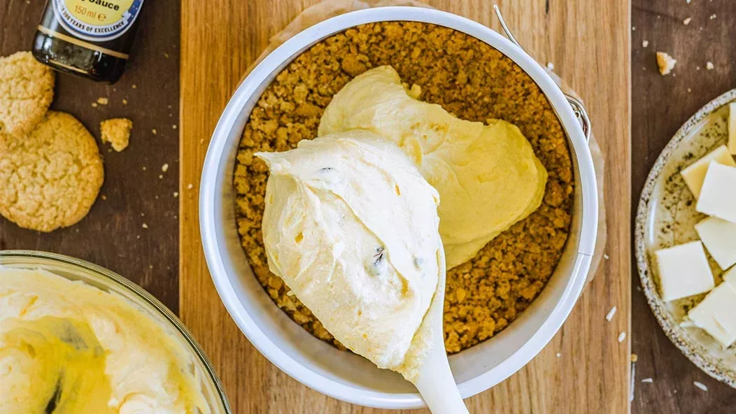 Verwarm de oven voor op 180 °C. Meng de gemalen koekjes met de gesmolten boter en de geraspte sinaasappelschil. Druk het mengsel in een met bakpapier beklede bakvorm. Bak 10 minuten en zet het dan opzij om af te koelen.