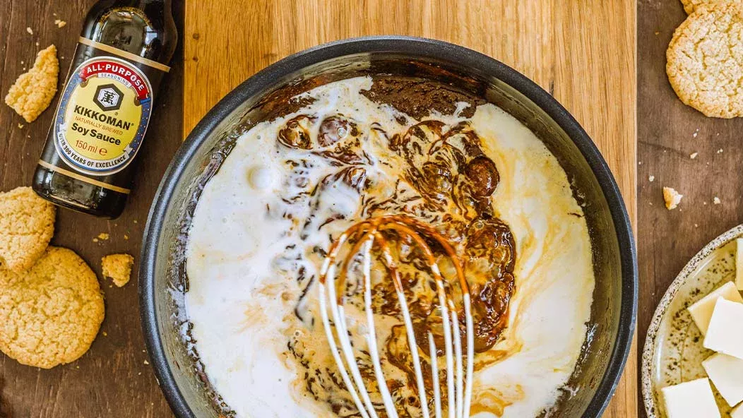 100 g kristalsuiker – 1 el boter – 200 g slagroom – 1 el Kikkoman Natuurlijk Gebrouwen Sojasaus
