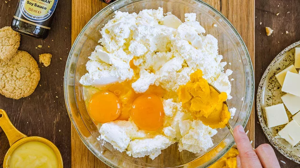 100 g witte chocolade – 40 g boter – 700 g gladde kwark – 3 eieren – 150 g pompoenpuree