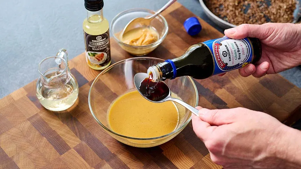 1 tl miso – 2 el appelazijn – 2 tl lijnzaadolie – 2 tl Kikkoman Natuurlijk Gebrouwen Tamari Glutenvrije Sojasaus – 1 tl Kikkoman Mirin-Stijl Zoet Koken Kruiden – Versgemalen peper – 2 tl lijnzaad (eventueel fijngemalen) – 2 el water