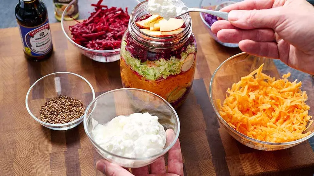 Schik de salade als volgt in een hoge slakom: dressing, rode kool, appel, wortel, radijs, spitskool, rode biet, peer, roomkaas en lijnzaad. Sluit de kom af en schud kort voor het serveren om de dressing te verdelen. Je kunt de salade ook in kommen serveren.