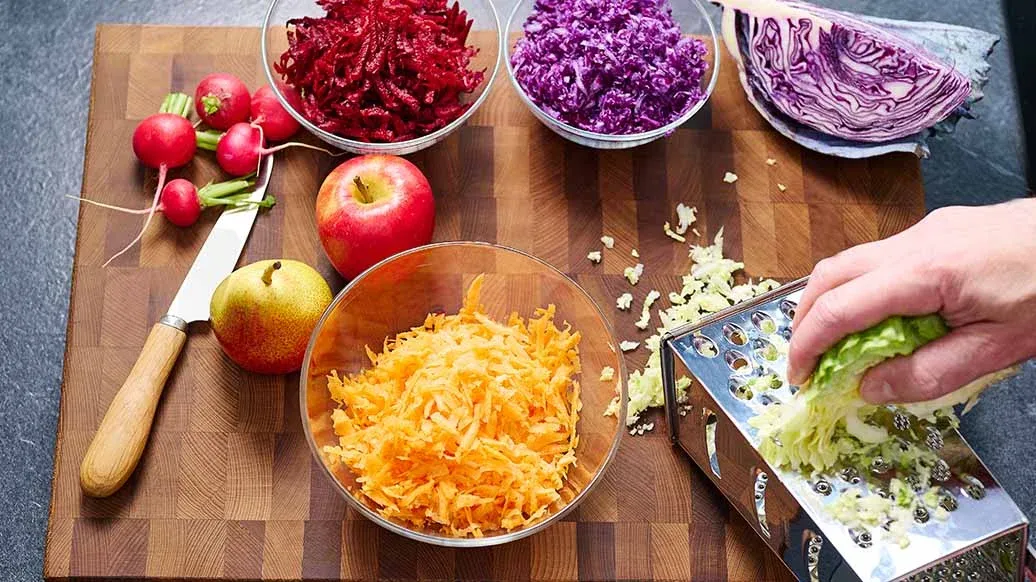 Rasp de spitskool, rode kool, rode biet en wortelen apart grof. Snijd de radijsjes in plakjes en snijd de appel en peer eerst in partjes en vervolgens in plakjes.