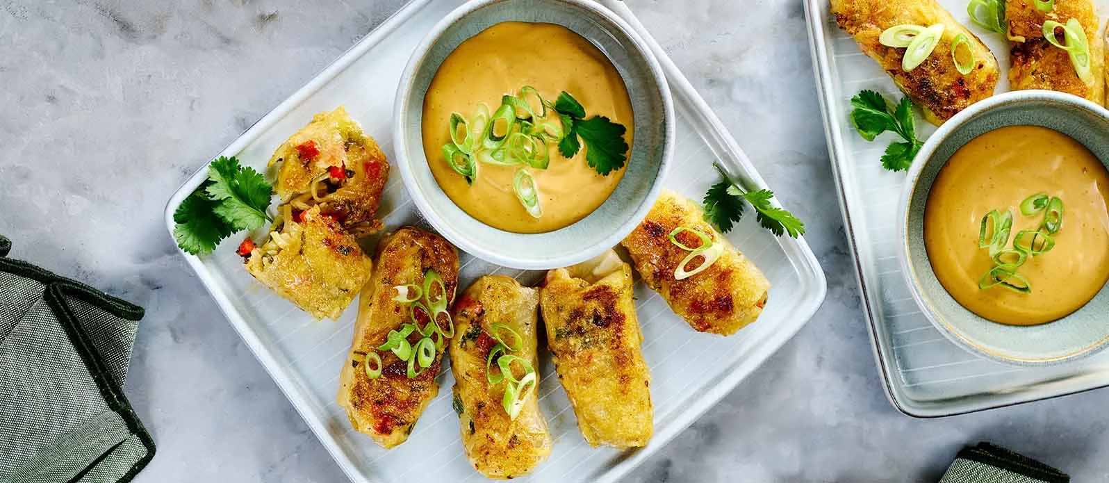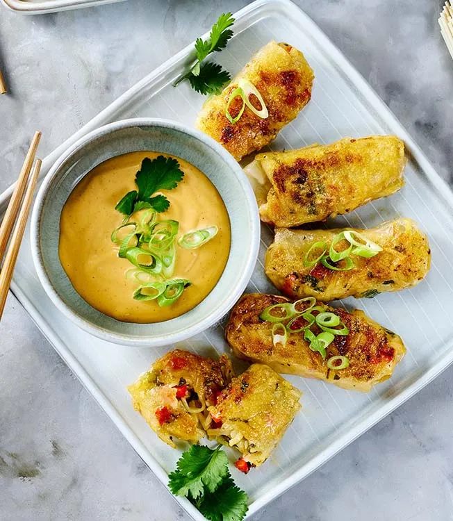 Snelle, knapperige rijstpapierdumplings gevuld met ramen, groenten en kaas, op smaak gebracht met Kikkoman Kimchi Chilisaus en Kikkoman Sojasaus. Geserveerd met een romige, pittige dip zijn ze een makkelijke, populaire snack of lichte maaltijd.