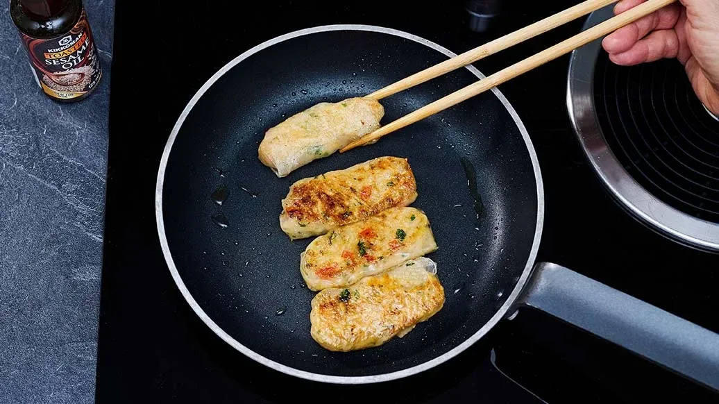 Verhit de Kikkoman Sesamolie in een grote pan en bak de dumplings 4-6 minuten tot ze aan alle kanten goudbruin zijn.