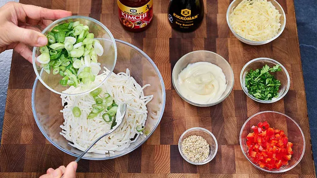 Meng de noedels met twee derde van de lente-uitjes, de koriander, rode peper, sesamzaadjes, de Kikkoman Kimchi Chilisaus, de mayonaise, kaas en Kikkoman Sojasaus.