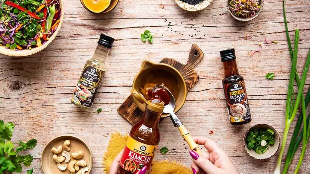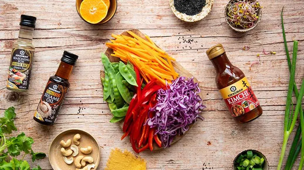 1 el Kikkoman Pittige Chilisaus voor Kimchi – 1 el versgeperst mandarijnsap – 1 el pindakaas – 1 el Kikkoman Geroosterde Sesamolie – 1 tl ahornsiroop – 1 tl Kikkoman Smaakverfijner voor Sushirijst (125ml) – ½ el water – 20 g cashewnoten – 2 tl zwarte sesamzaadjes