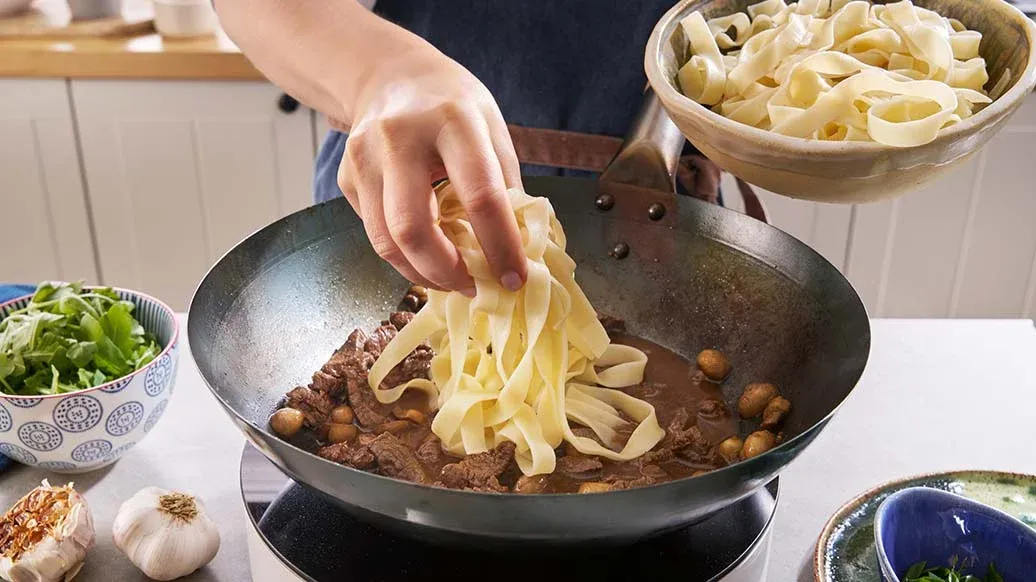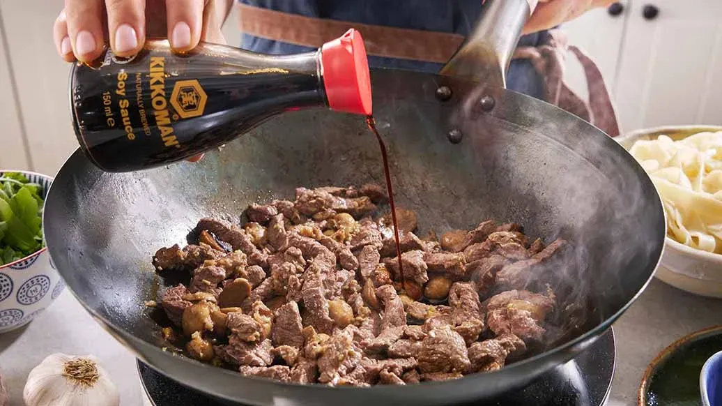Een rijke en aromatische roerbakschotel waarin Kikkoman Sojasaus de smaak van mals rundvlees, geroosterde knoflook en aardse champignons versterkt, waardoor een perfecte balans ontstaat met de zijdezachte tagliatelle.
