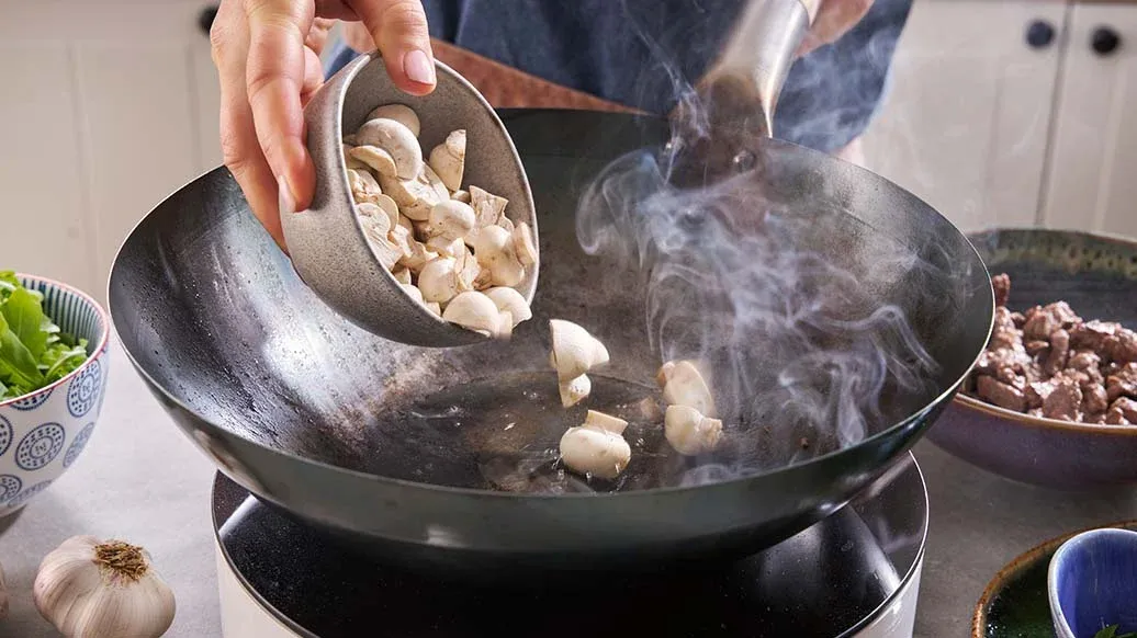 Voeg nog wat olie toe aan dezelfde wok en bak de champignons 3-4 minuten tot ze goudbruin zijn.