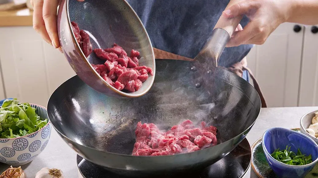 Verhit een wok, voeg de olie en het rundvlees toe en roerbak 2-3 minuten tot het bruin is. Haal uit de wok en zet apart.