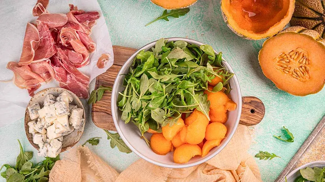 Snijd de gorgonzola in stukjes en scheur de prosciutto in kleinere stukjes. Was en droog de rucola. Doe alles in de kom met de meloen en meng voorzichtig.
