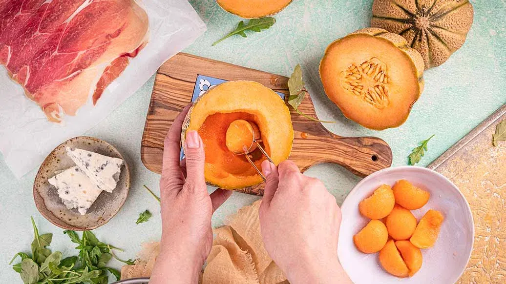 Snijd de meloen doormidden en verwijder de pitten. Gebruik een meloenbolletjeslepel om bolletjes te maken of snijd de meloen in blokjes. Doe de meloen in een kom.