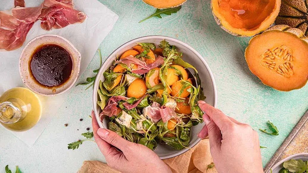 Deze zomerse salade combineert zoete meloen met romige gorgonzola, pittige prosciutto en peperige rucola. Een dressing van olijfolie, honing en Kikkoman Sojasaus Minder Zout zorgt voor een umami-smaak. Perfect voor een lichte lunch of een stijlvol voorgerecht.