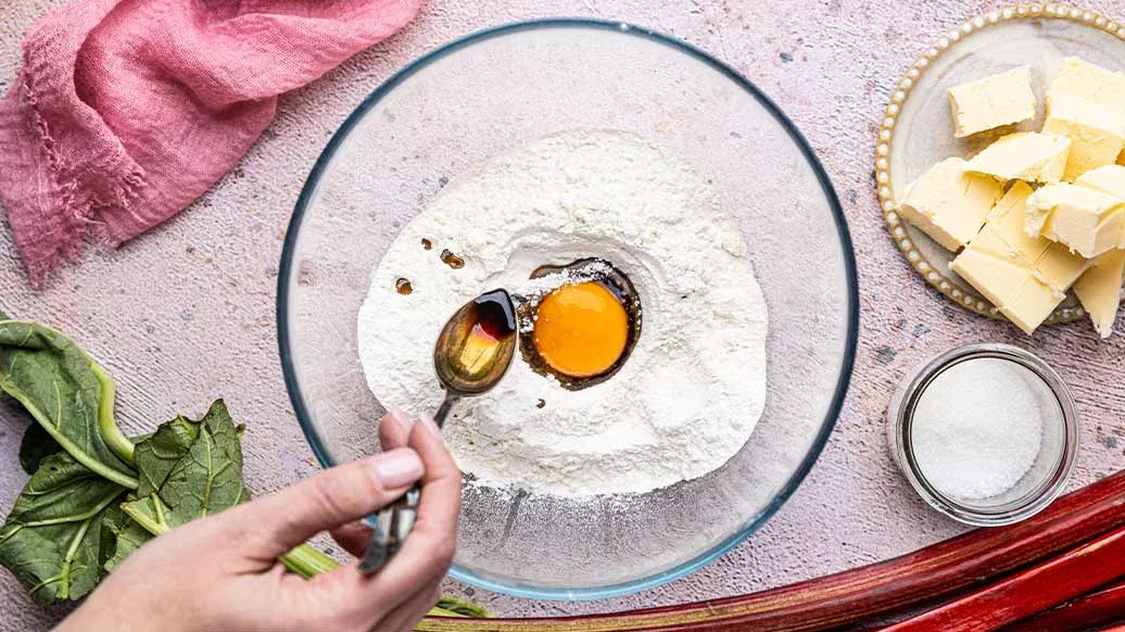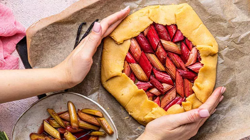 Rol het deeg uit. Leg de rabarber in het midden en vouw de randen van het deeg om. Bak circa 30-35 minuten in een voorverwarmde oven van 200 °C.