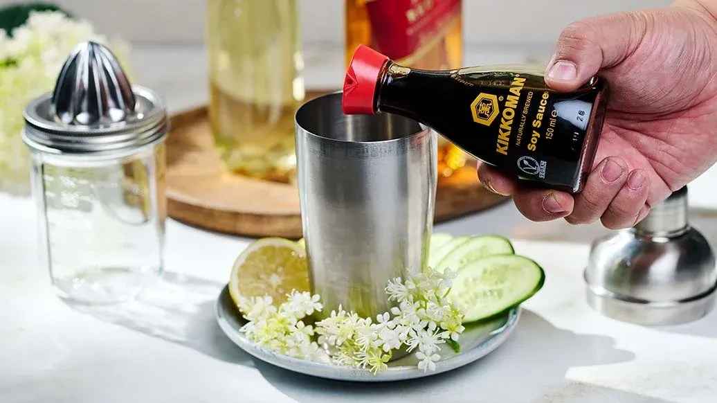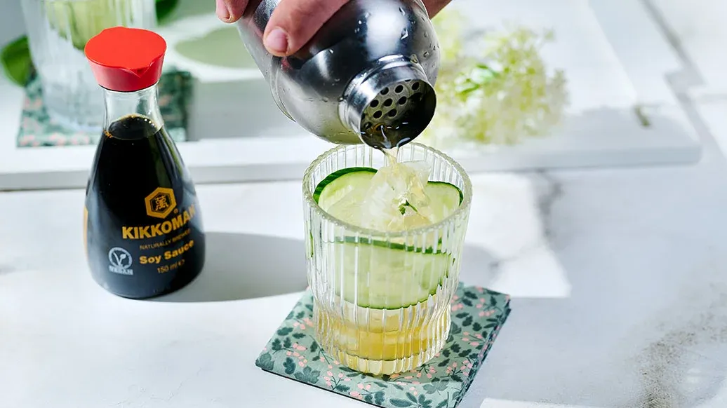 2 cocktailshakers – 6 ijsblokjes – 120 ml scotch – 80 ml citroensap – 40 ml vlierbloesemsiroop – 2 scheutjes Kikkoman Natuurlijk Gebrouwen Sojasaus – 4 sneetjes komkommer