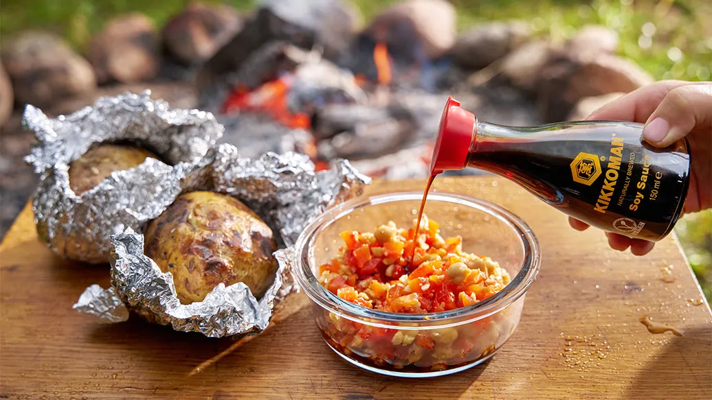 In de sintels gebakken aardappel met een subtiel rokerig aroma, gegarneerd met een salsa van geroosterde rode paprika, knoflook en kikkererwten, afgewerkt met Kikkoman Sojasaus.