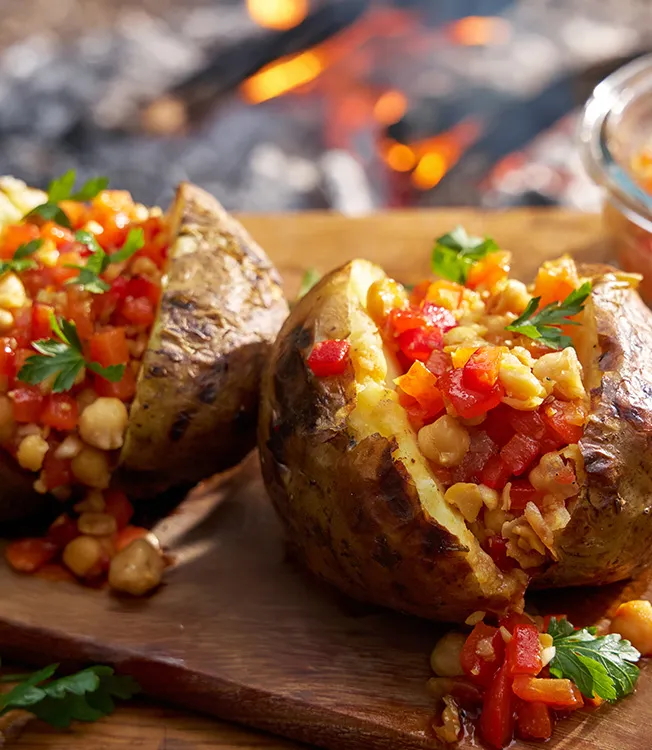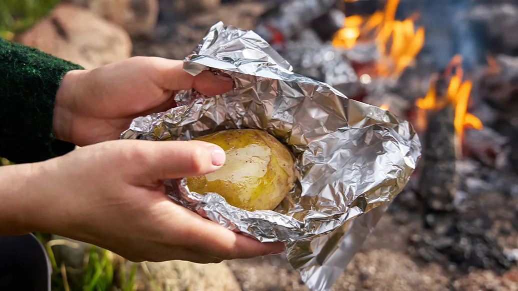 Besprenkel de aardappelen met de koolzaadolie, wikkel ze in aluminiumfolie en stop ze ongeveer 40 minuten tussen de sintels van het kampvuur.
